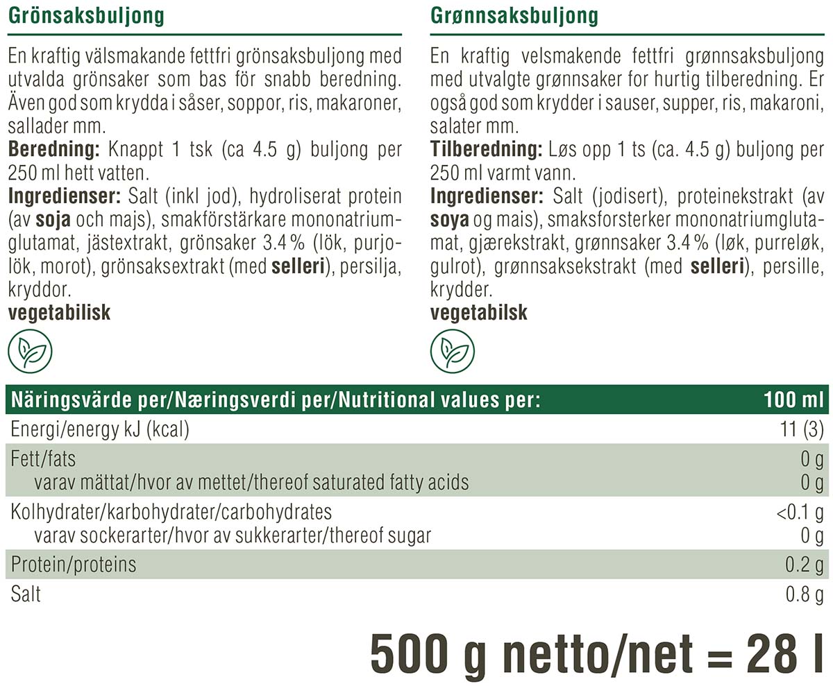 Alpnaerings Grønnsaksbuljong er en vegetabilsk buljong som er veldig konsentrert med rik grønnsakssmak, har lavt saltinnhold og er helt fettfri.