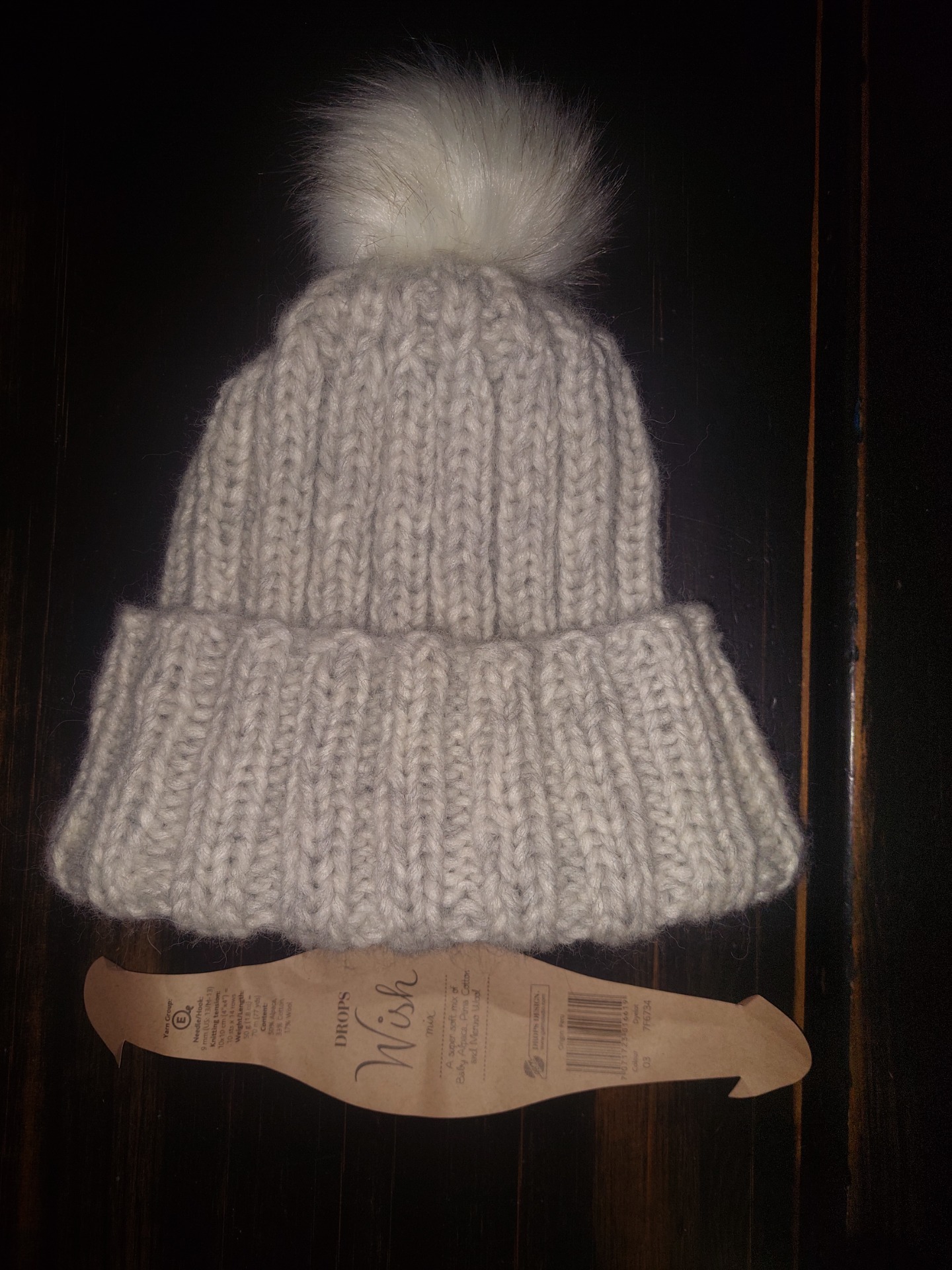 Damelue str. M  strikket i Wish fra Dropsdesign med imitert dusk. Deilig og myk. Farge lys grå.