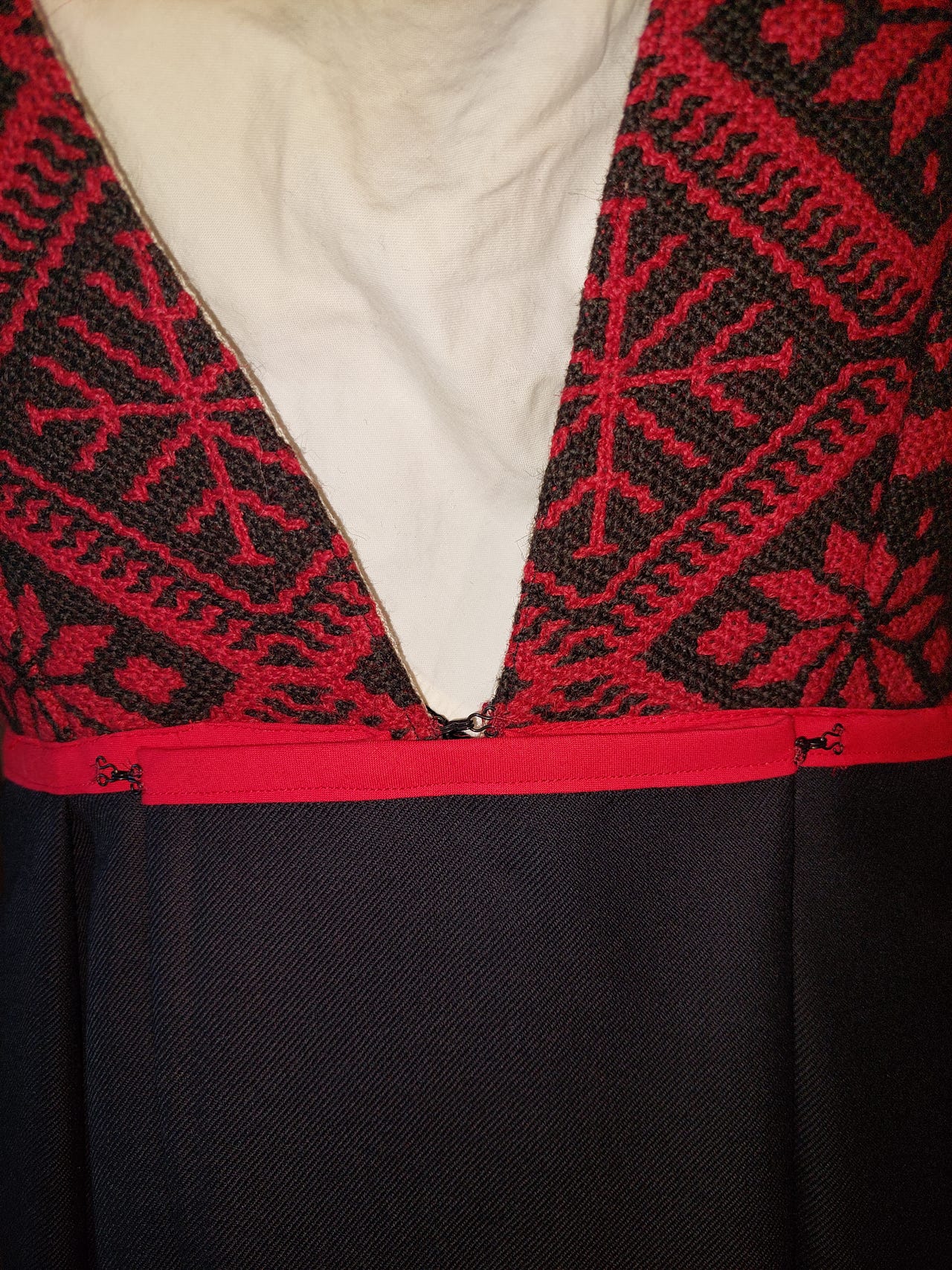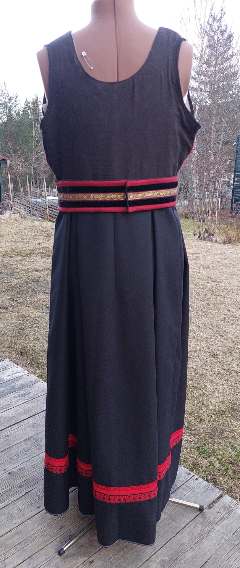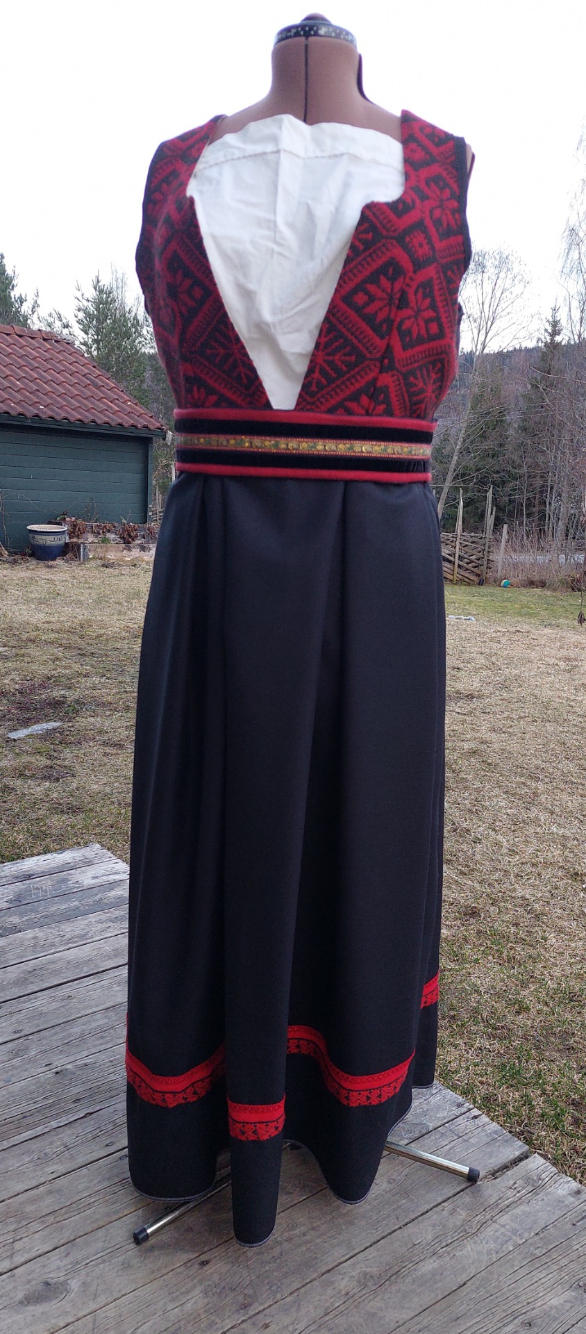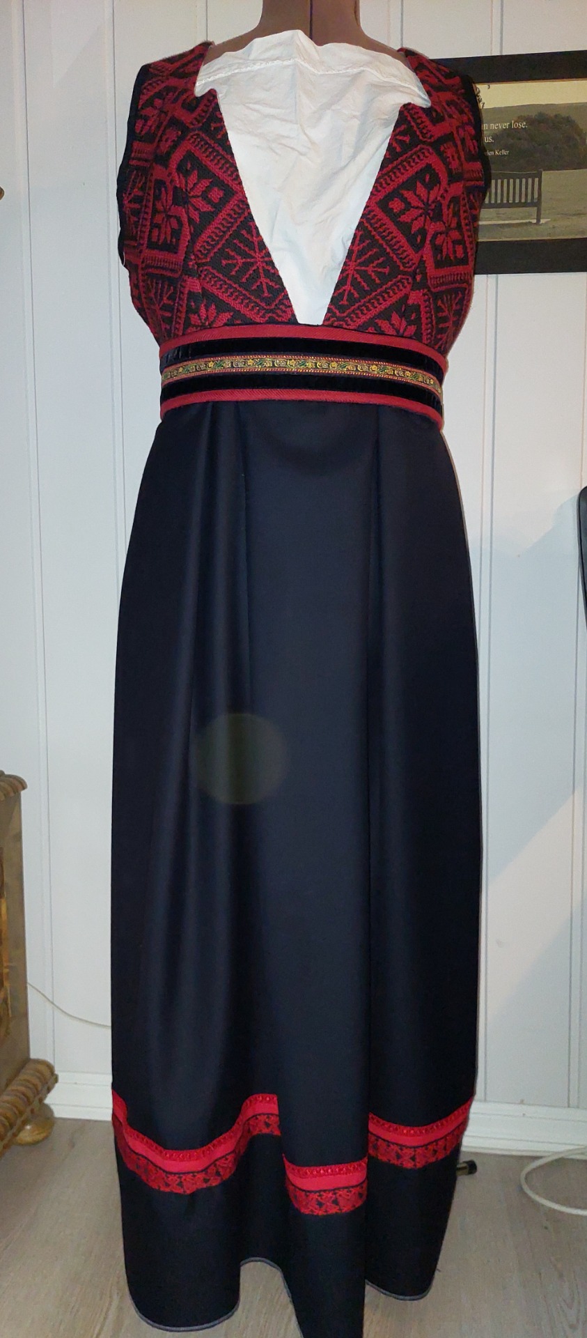 Livet på denne er laget av et vevd Trønder Åkle foret med basker lin og matt brokade i ryggen.. Skjørtet er i tynn ganske flatt 100 % ull. Livvidde er nå 104 men kan justeres ved å flytte hektene i livet og trykknapper i beltet. Stakken er ikke lagt opp så lengden kan tilpasset kjøper. Lagd ut fra mønsteret til Fæbrik.