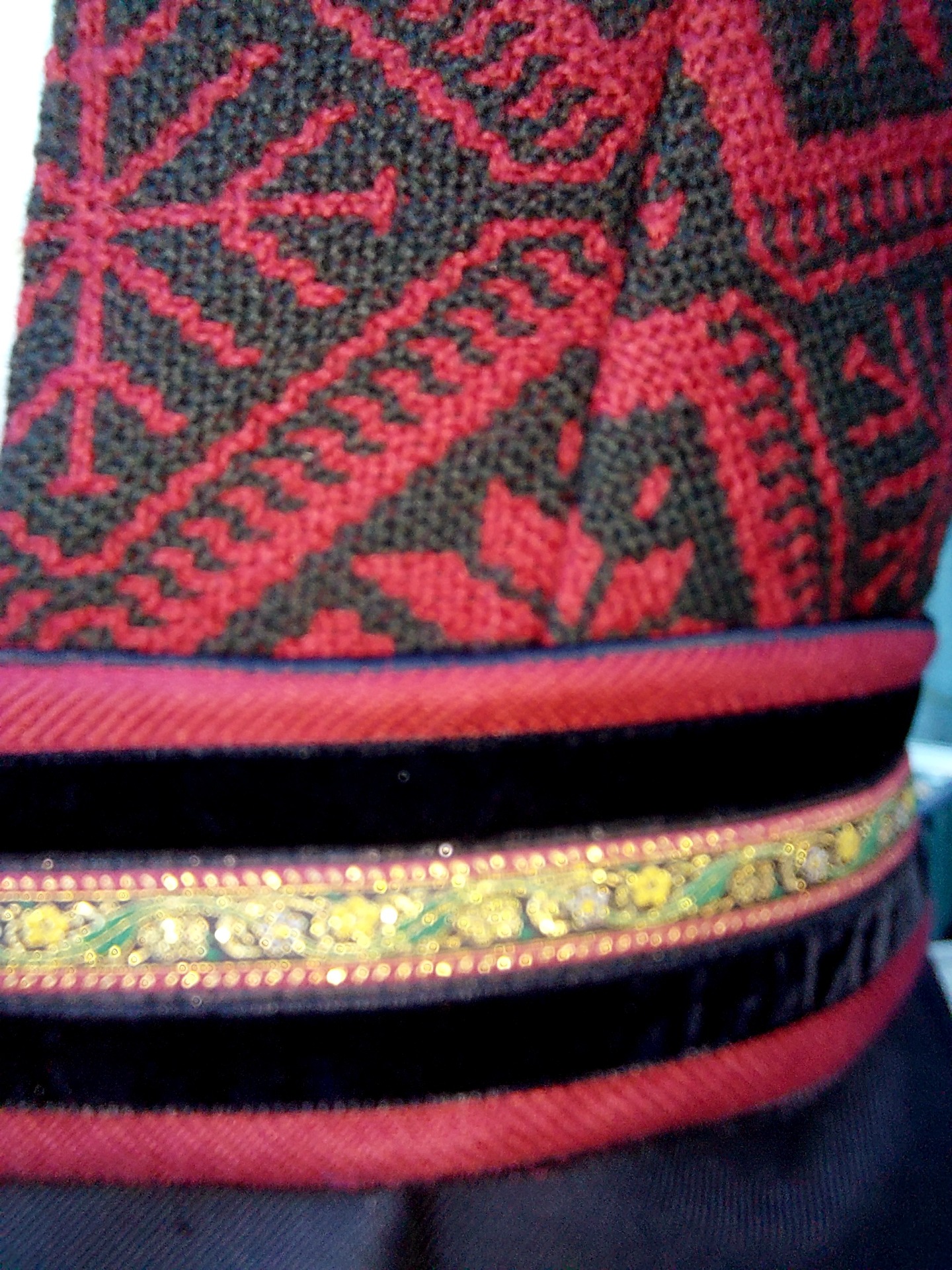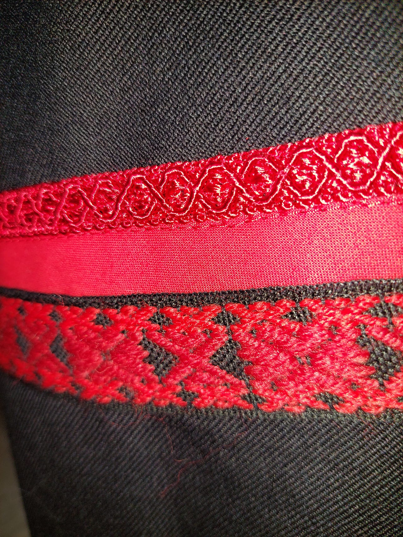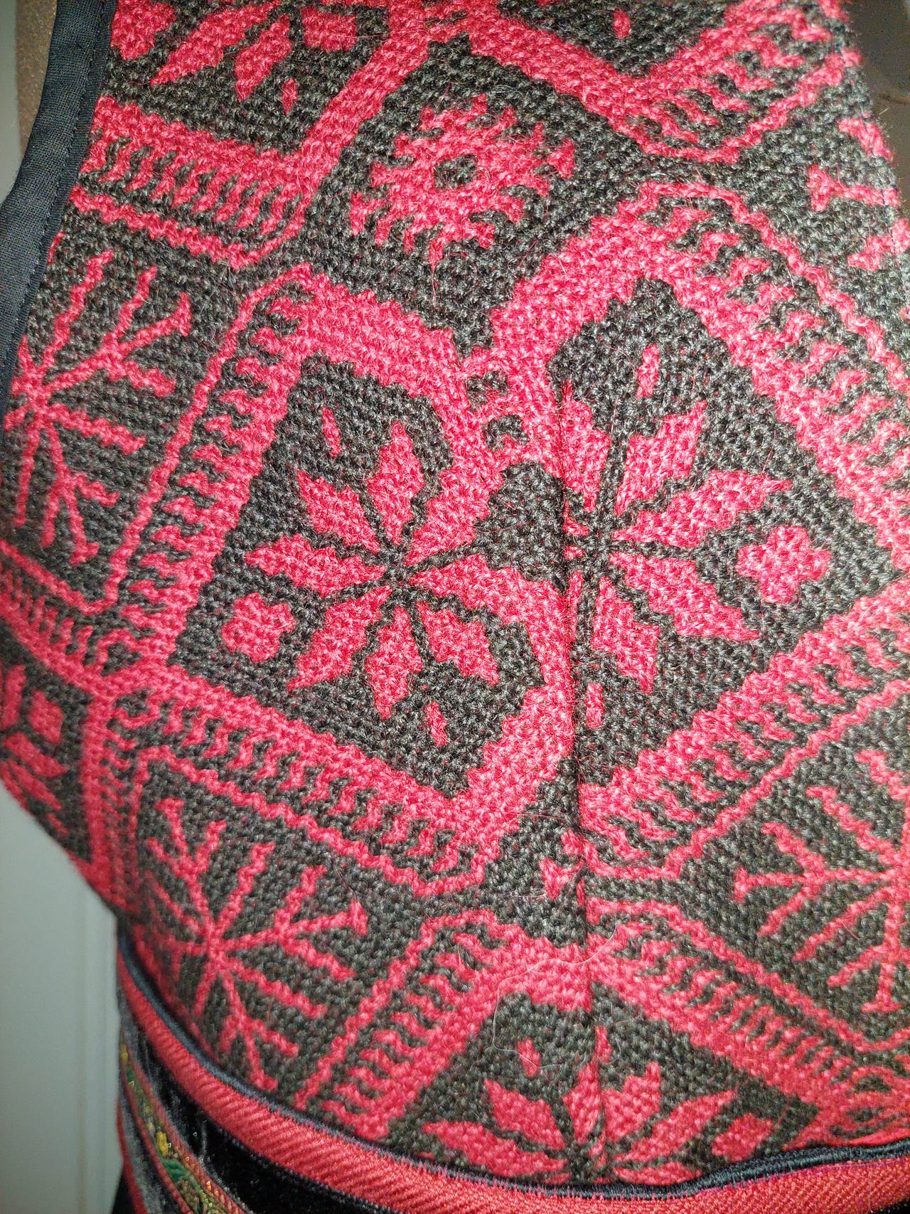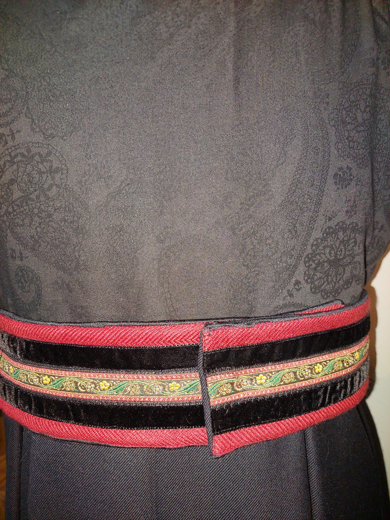 Livet på denne er laget av et vevd Trønder Åkle foret med basker lin og matt brokade i ryggen.. Skjørtet er i tynn ganske flatt 100 % ull. Livvidde er nå 104 men kan justeres ved å flytte hektene i livet og trykknapper i beltet. Stakken er ikke lagt opp så lengden kan tilpasset kjøper. Lagd ut fra mønsteret til Fæbrik.