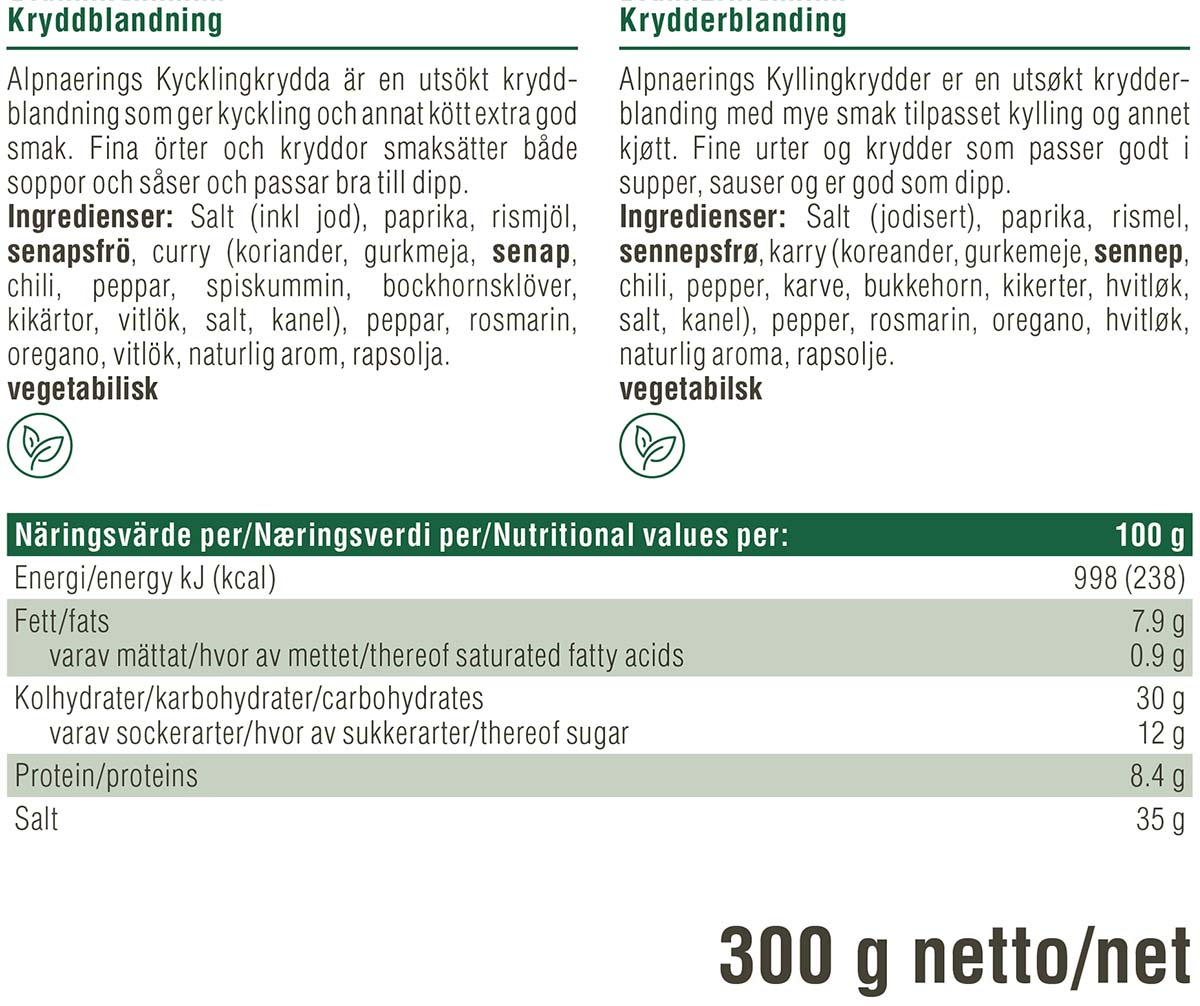 Alpnaerings Kyllingkrydder er en utsøkt krydderblanding med mye smak tilpasset kylling og annet kjøtt. Passer godt i supper, sauser og gryteretter.