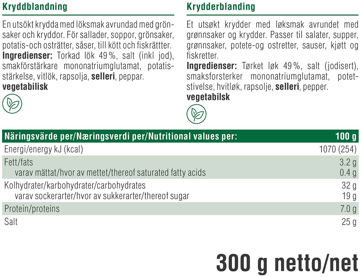 Alpnaerings Løkkrydder forhøyer smaken i mange ulike retter. Den passer utmerket om du vil ha løksmak, men unngå synlig løk. Prøv gjerne på potetmos, i gratenger m.m.