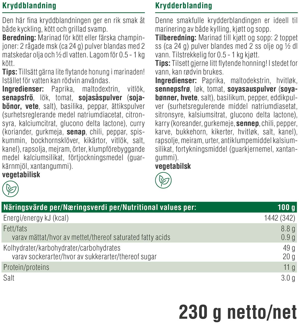Alpnaerings Marinade gir en god smak til marinering av kylling, kjøtt og til grønnsaker. Er også god som krydder.