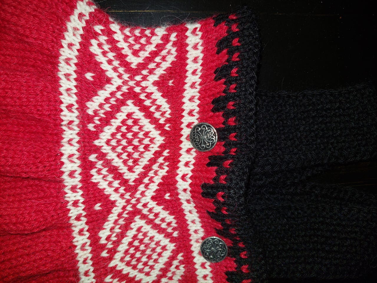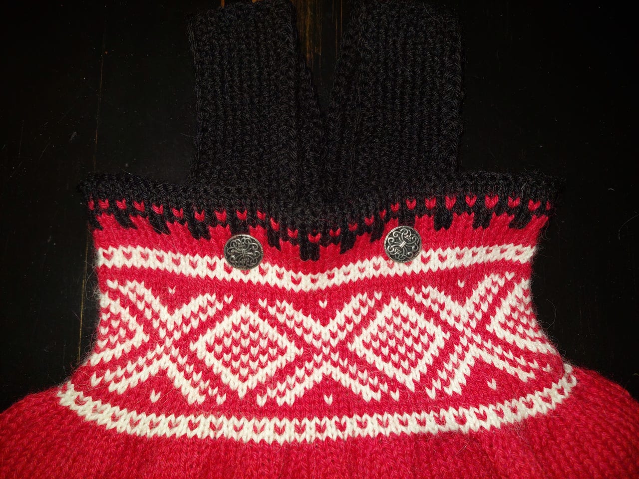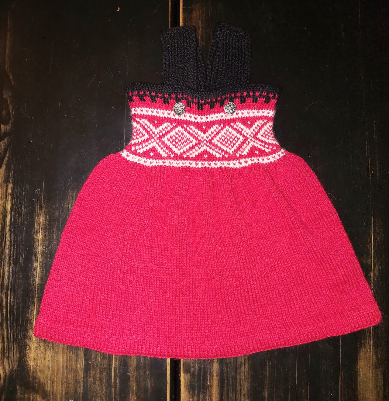 Seleskjørt strikket i alpakkagarn med mariusmønster. Knappene er festet på selene så de kan flyttes og skjørtet kan vokse med barnet en periode. Svarte seler og overkant.
