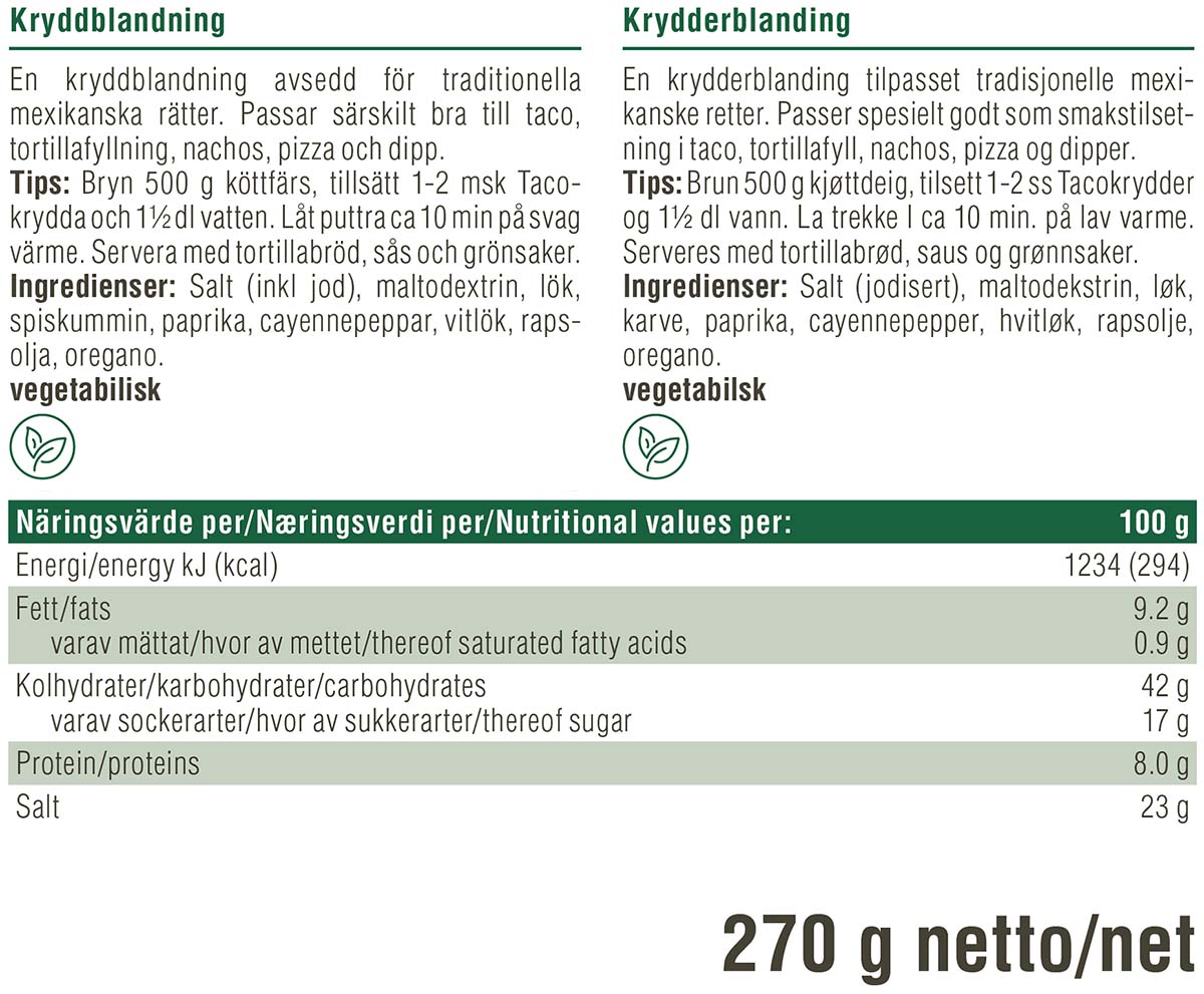 Alpnaerings Tacokrydder er et mexikansk inspirert krydder som er svært rik på smak, og passer til mange internasjonale retter som taco, tortilla, tapas, salsa, pizza og nachos.